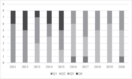 A positive evolution of these journals in terms of impact and indexation can be seen with the better position in the SJR quartiles in 2020 compared to 2011. The distribution of the articles by year was stable, even though there was variability in the number of papers published.