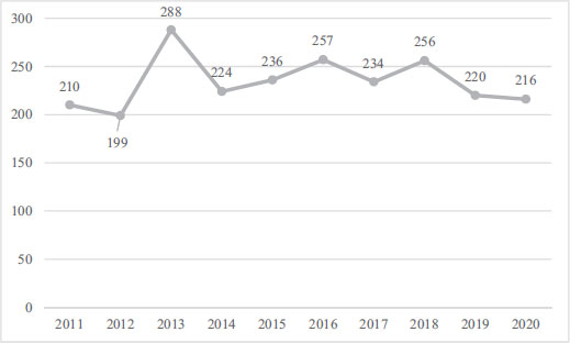 Between 2011 and 2020, the eight journals published a total of 2340 articles that, when analysed by year, show the stability of the production, with between 200 and 250 articles being published per year, except for 2013, in which a journal published an extraordinary number of more than 60 articles, which was an increase of more than 40% (Figure VI).