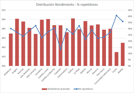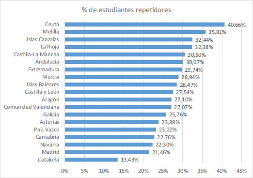 Por otra parte, el porcentaje de repetidores tampoco es homogéneo en las diferentes Comunidades Autónomas de España, como se puede ver en la figura I para los datos de PISA 2018.