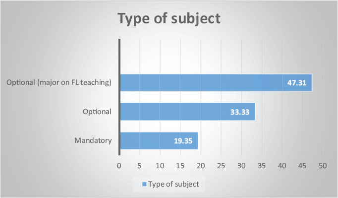 De todas las asignaturas que mencionan AICLE, el 47.31% son asignaturas optativas en la especialidad de enseñanza de lenguas extranjeras (para maestros/as especialistas). Además, el 33,3% de las guías docentes analizadas eran asignaturas optativas disponibles para todo el alumnado en el grado, mientras que solo el 19,35% eran obligatorias (Figura II).