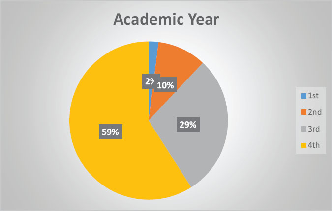 Como se puede ver en la Figura IV, la mayoría de los cursos (59%) que tratan sobre AICLE se imparten en el último año del grado (4º año). Esto no es sorprendente, ya que la mayoría de ellos son asignaturas optativas que generalmente se ofrecen en los últimos dos años de los programas de Grado en España.