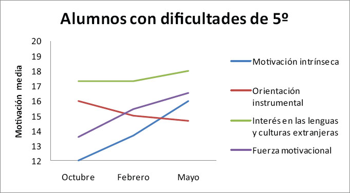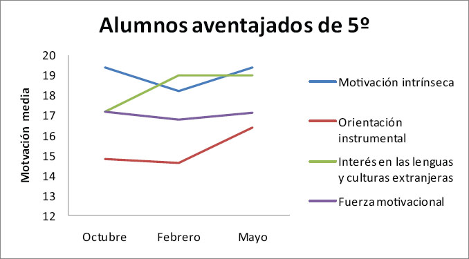 La motivación instrumental también crece en el caso de estos alumnos más aventajados, de 14,80 puntos a 16,40 puntos, pero sólo en el cuestionario de mayo. Esto podría estar relacionado con el examen externo al que se presentaban los alumnos unas semanas después de rellenar este último cuestionario, o con su mayor preocupación por las notas en este momento del curso académico, como puede verse en esta respuesta a un cuestionario de mayo: “Me gustaría tener más ‘tareas extra’ como el año pasado para poder sacar mejor nota” (S, mayo, lo que menos me gusta).