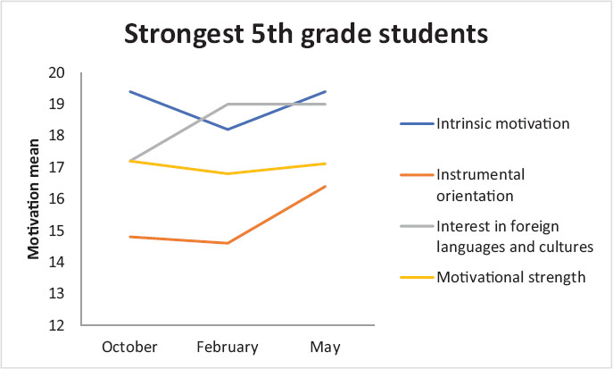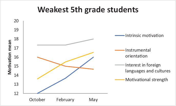 The graphs show a combination of almost level lines with others that show some changes over time. Thus, in the case of the stronger students, motivational strength and intrinsic motivation stay stable over time, while the other two scales show some slight positive variations (see Graph I). The first type of motivation that grows is students’ “Interest in foreign languages and cultures”. As was seen in the case of the whole group, this strengthened interest may be related to the nature of the tasks they do in their English lessons, which this group of students describes as “fun” and “interesting”. In fact, students appreciate “that we learn new things I didn’t know” (S, May, what I like most), which could refer both to the language or to the topics dealt with, as becomes visible in the analysis of the answers of the whole group.
