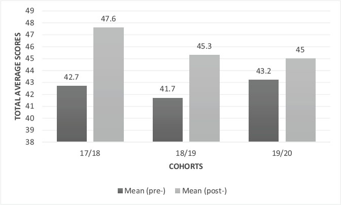 The data-gathering tools were administered in the same way to all three cohorts participating. The Likert-scale questionnaire was delivered in the first week of class in September/October. In December, participants could see their initial responses and change them using a different colour if they did not agree with them. Descriptive and bivariate analysis was performed using SPSS V.20.