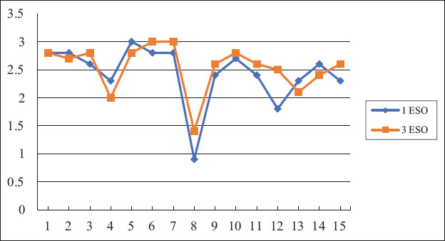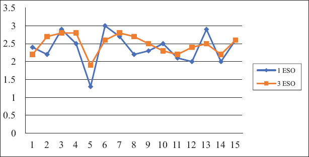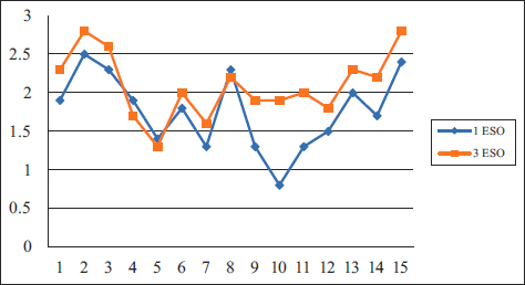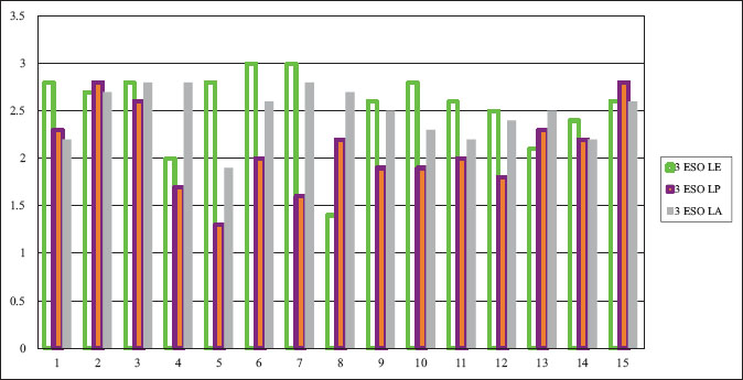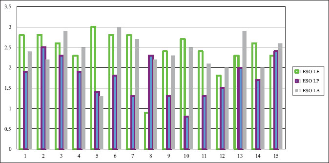 La puntuación de las redacciones se hizo de 0 a 3 puntos. Este estudio es experimental longitudinal exploratorio puesto que se recopilan datos de los mismos grupos de alumnos en dos momentos académicos distintos (Cubo, Martín y García, 2011) con dos años de diferencia entre ellos: 1º y 3ºESO. La investigadora consideró que un período de un año entre la recopilación de datos podría haber sido suficiente para observar cambios en la adquisición del conocimiento histórico y su expresión escrita. Sin embargo, se decidió que un intervalo de dos años de diferencia entre los datos arrojaría resultados estadísticos más significativos. El enfoque exploratorio del estudio se enmarca en el hecho de que analiza un problema que no ha sido muy estudiado desde el punto de vista de un historiador. Por definición, el enfoque exploratorio identifica tendencias, contextos y potenciales relaciones entre las variables, pero requiere una más amplia investigación (Hernández Sampieri et al, 2010; Cubo et al, 2011), como es el caso de este estudio. El primer objetivo eras estudiar la evolución en el aprendizaje de la Historia por parte del alumnado y comprobar si había seguido una trayectoria regular sin que la lengua vehicular hubiese supuesto una rémora para el aprendiz. El segundo objetivo era analizar la forma de expresar de forma escrita los conocimientos de Historia en lengua extranjera. Se partió de una hipótesis nula: los alumnos que estudian historia en secundaria pierden contenidos y ven reducida su expresión escrita por haberlos aprendido en lengua extranjera. Las preguntas de investigación fueron:
