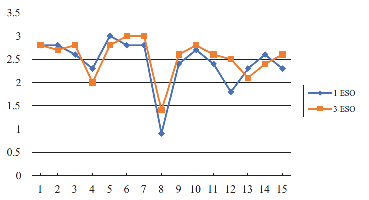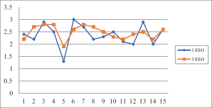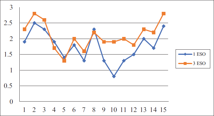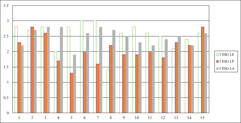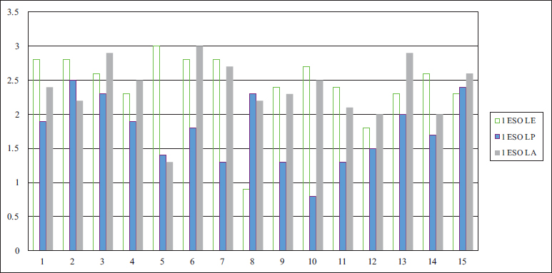 The scoring of the essays was from 0 to 3 points. This is an exploratory longitudinal experimental study since the data were collected from the same groups of students at two different academic moments (Cubo et al, 2011) with two years of difference between them: Y1st ESO and Y3rd ESO. The researcher considered that a one-year gap between the data collection could have been sufficient to observe changes in the acquisition of historical knowledge and essay-writing skills. However, it was anticipated that a two-year interval would yield more statistically significant results. The exploratory approach of the study is grounded in the fact that it examines an issue that has not been extensively studied from the perspective of a historian. By definition, exploratory approaches identify trends, contexts and potential relationships between variables, but require more extensive research (Hernández Sampieri et al, 2010; Cubo et al, 2011), as is the case of this study. The first goal was to assess how students’ learning of history had progressed over time and whether it had maintained a consistent path, unaffected by the language of instruction as a potential barrier to their learning. The second objective was to analyze the written expression of history in a foreign language. The starting point was a null hypothesis: secondary school students who study history in a foreign language experience content loss and a reduction in their written expression due to having learned it in a foreign language. The research questions were: