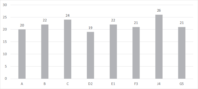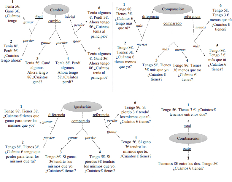 Finalmente, se categorizó cada estructura respecto al nivel de dificultad semántico-matemática, siguiendo el modelo de estrategias de resolución de Riley y Greeno (1988) para las estructuras aditivas, y los planteamientos de Greer (1992) y Vergnaud (1991) para las multiplicativas. Se consideraron fáciles las estructuras aditivas de cambio 1 y 2, comparación 1 y 2, igualación 1 y 2, y combinación 1; y las estructuras multiplicativas de razón simple, ya que son los más próximas a las de estructura aditiva (pueden llegar a resolverse como sumas o restas repetidas). Se consideraron de dificultad media las estructuras aditivas de cambio 3 y 4, comparación 3 y 4, igualación 5 y 6 y combinación 2 (ver Riley y Greeno, 1988, para las estructuras de combinación 2); y las multiplicativas de razón múltiple y las de comparación multiplicativa consistente, es decir, en las que los términos del problema ‘veces más’ o ‘veces menos’ coincidiera con la operación necesaria para resolverlo (una multiplicación y una división, respectivamente, ver Xin, 2007). Finalmente, se consideraron difíciles las estructuras aditivas de cambio 5 y 6, comparación 5 y 6, y de igualación 3 y 4, y las multiplicativas de comparación inconsistente, matriz rectangular y producto cartesiano.
