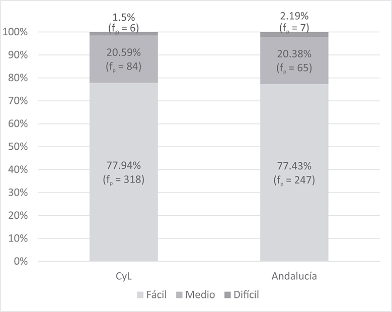 En CyL se utilizaron 46 libros de 16 editoriales, mientras que en Andalucía se utilizaron 15 libros de 8 editoriales. Los libros más frecuentes en CyL fueron diferentes a los más utilizados en Andalucía, confirmándose la hipótesis 1. No se encontró una asociación significativa entre los libros utilizados en ambas comunidades autónomas (p <.001), siendo grande el tamaño de la diferencia (.81). En CyL los más utilizados fueron 1-1 (30.97%); 1-2 (12.78%); 2-1 (13.35%); y 3-1 (14.48%). En cambio, en Andalucía los libros más frecuentes fueron: 1-2 (26.18%); 1-3 (9.6%); 2-2 (31.92%); 3-2 (11.91%); y 4-2 (8.08%). Asimismo, el porcentaje de uso en CyL de 1-1, 2-1 y 3-1 fue mayor que en Andalucía; en cambio, en Andalucía se utilizaron con más frecuencia los libros 2 y 3 de las editoriales 1 y 2, y los libros 3-2, 4-2 y 6-1 (ver Tabla I).