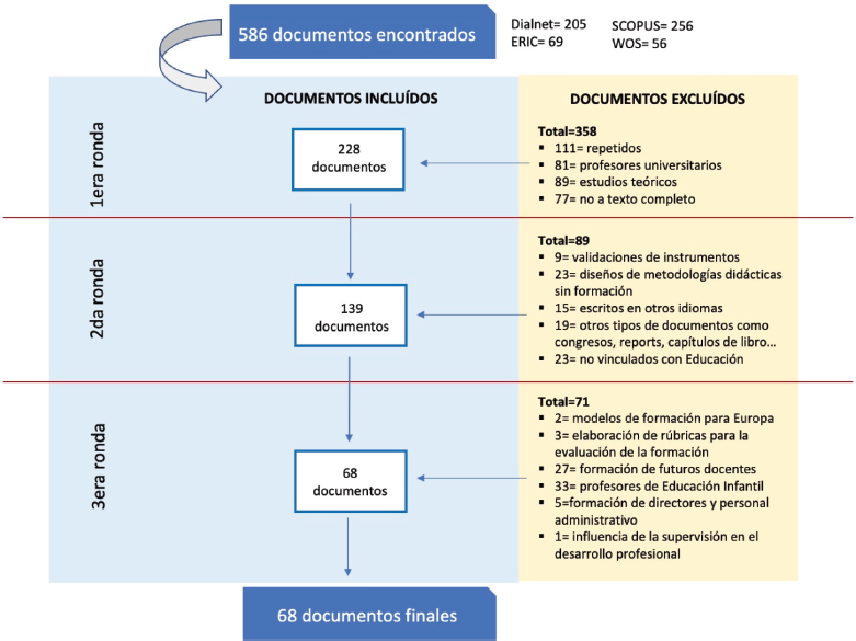 El análisis de los 68 documentos finales se realizó a través de un manual de codificación conformado por variables extrínsecas (año de publicación y procedencia de los autores) variables metodológicas (muestra y método de investigación empleado) y variables sustantivas (en qué se forman los docentes, características de los modelos de formación recibida e impacto) (manual de codificación.xlsx).