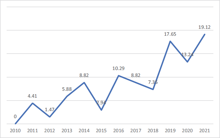 El 50% de los estudios analizados se concentra entre 2019-2021 y el 76.47% desde el año 2016. Entre 2010 y 2021 se observa un incremento interesante en la formación de los docentes siendo el año 2021 con la mayor producción científica (19.12%) (Figura II).