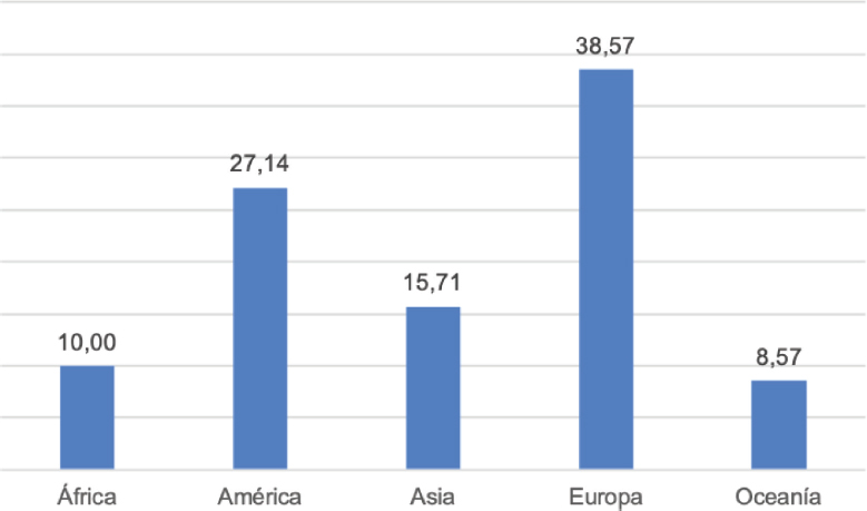 Nota: figura que representa el porcentaje de publicaciones por continente.