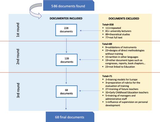 The analysis of the 68 final documents was done with a codification manual composed of extrinsic variables (year of publication and origins of the authors), methodological variables (sample and research method used) and substantive variables (what teachers are trained in, characteristics of the training models received and impact) (coding manual.xlsx).