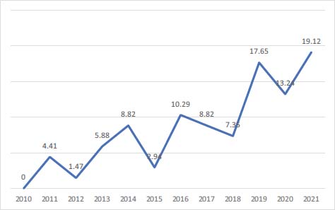 50% of the studies analyzed lie within the period 2019-2021 and 76.47% are from since the year 2016. An interesting increase in teacher raining can be seen between 2010 and 2021, the latter year being notable for the largest scientific production (19.12%) (Figure II).