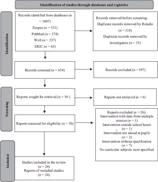 The researchers defined the terms to be used in the PICO strategy. The search was reviewed by the staff of the Resource Centre for Learning and Research (RCLR) of the University of Deusto to reaffirm the suitability of the search. The studies identified were selected based on inclusion and exclusion criteria (Table I). The selection process (Figure I) was carried out by the responsible investigators. Independently, they reviewed the screening of titles, abstracts, and studies in an Excel document. In case of discrepancy, this was resolved by discussion until a simple majority consensus was reached. Thus, of the 1007 studies identified (654 excluding duplicates) in the Scopus, PubMed, WoS, and ERIC databases, 24 studies were selected for analysis. Duplicate documents were removed using Rstudio (R.4.2.0) (n = 318) and independently reviewed and excluded by the study researchers (n = 35). This selection process followed the inclusion and exclusion criteria (Table I).