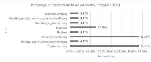 Of the 24 articles, 37.93% included PA as part of their intervention, 34.48% emotional well-being, 20.69% nutrition, and 6.90% hygiene. These HLH were grouped in some interventions working on several variables simultaneously; therefore, there are univariate and multivariate interventions (Figure II).