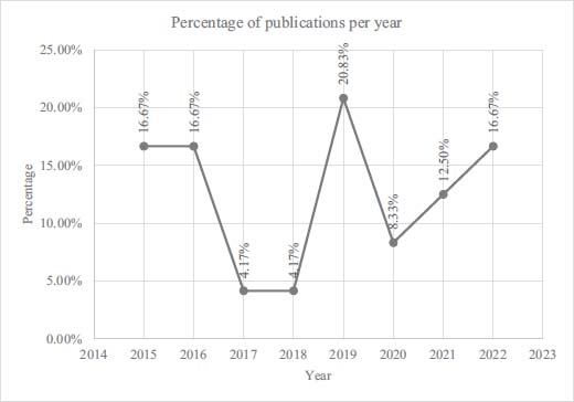 These articles were published in 20 different journals, with the International Journal of Environmental Research and Public Health being the most frequent (16.67%), followed by Trials (8.33%). Regarding the publication date, the number of studies published over the seven years varied from one publication per year to five, four being the most frequent number (Figure III).