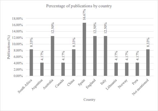 Likewise, interventions were identified across 12 countries, with Spain performing the most interventions (16.67%), followed by England (12.50%), Italy (12.50%), and Australia (12.50%) (Figure IV). In general terms, PA, emotional well-being, and nutrition were the HLH worked on in these interventions. PA was present in 53.85% of the studies, emotional well-being in 46.15%, and nutrition in 23.08%. It is worth mentioning that 15.38% of these studies worked on more than one HLH, all of which were implemented in Spain. This same country, Spain, was the only one that worked on the three aforementioned HLH (8.33% PA, 8.33% emotional well-being, and 12.50% nutrition), whereas England (4.17% PA, 8.33% emotional well-being, and 0% nutrition), Italy (8.33% PA, 4.17% emotional well-being, and 0% nutrition), and Australia (8.33% PA, 4.17% emotional well-being, and 0% nutrition) did not work on nutrition in any of the interventions selected in this study.