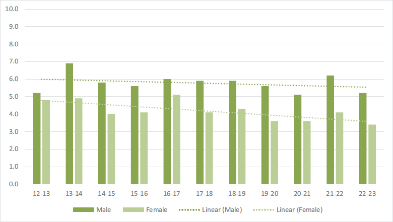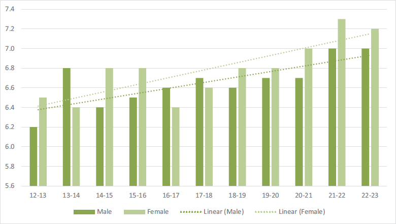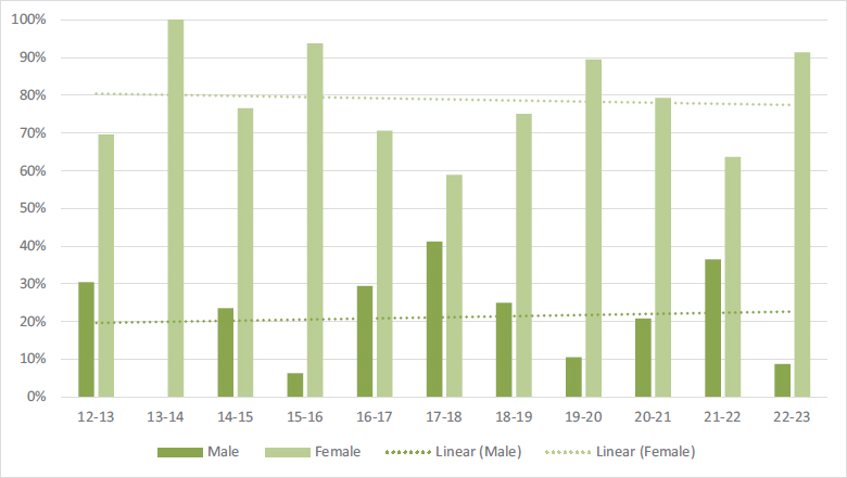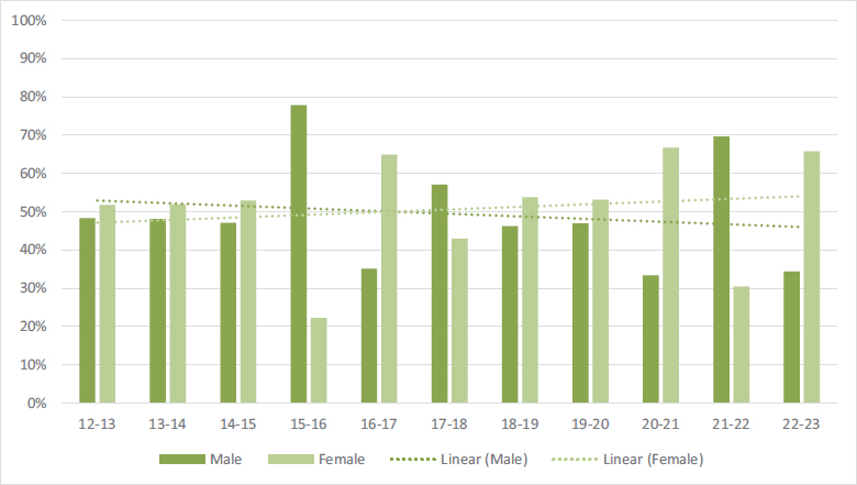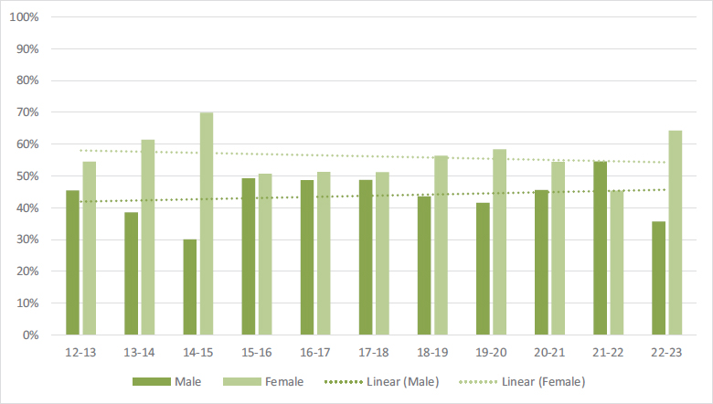 Another result observed in this study, and one in which female students come out on top, is the university entrance score, in line with other studies that show a better academic profile for women (Fernández-Herrero et al., 2022). The trend towards an increase in this access mark over the years observed in the data obtained in this study also points to a good prognosis, in this case for both men and women.