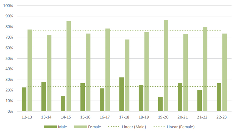 Other studies that have pointed to strong feminization in education and nursing courses are Grañeras Pastrana et al. (2001) (cited by Porto, 2009) and Ariño et al. (2022). The latter study also shows greater parity in the fields of economics, business and tourism. These gender differences by field of study also occur in all OECD countries: ‘Women are in the majority in the field of health and welfare for all countries among those entering short tertiary cycles’ (OECD, 2023), with data for the year 2021.