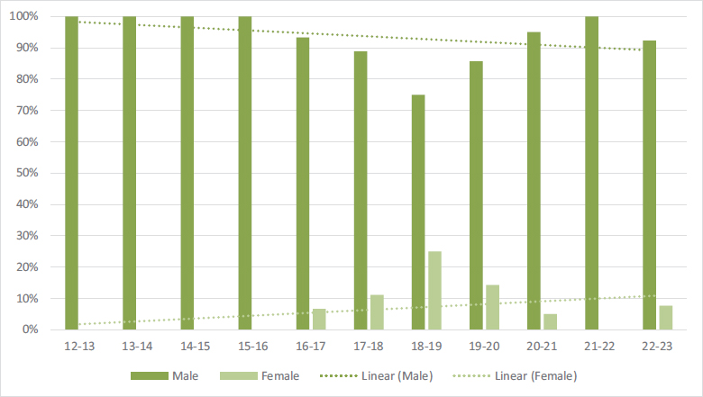 This final graph reflects the masculinization of technology studies, as other research has also highlighted (Ariño et al., 2022; Hill et al., 2010; OECD, 2023; Tejuca Martínez, 2020; Watt, 2010). Although the trend seems to be moving towards a reduction of this difference, the starting point is such a low representation of women in these studies that it is difficult to reach the desired parity, and the extreme categorization of highly masculinized studies proposed by Ariño et al. (2022) has continued to apply. In the data from 2021 published in the report on the education panorama (OECD, 2023), we observe that, on average in OECD countries, women are under-represented in the STEM fields but over-represented in the fields of health and welfare and education. In health and welfare and education, the average for these countries is a percentage of between 79 and 80% of women, with an even higher figure in Spain (90.9%). However, in the STEM field, women make up less than 25% of the OECD (24.1%) and EU25 (23.5%) averages. Once again, the gender gap is wider in Spain, where women represent only 15.6% of the total. Considering these data, we can see that, for the year 2021 (academic year 2021–2022), the gender gap in the area of health and welfare in Andorra is the same as the average of the OECD countries, but with a slightly lower gap than the average for studies in the area of education. Meanwhile, the gender gap in Andorra is higher than the OECD average in the field of technology. One point to be considered, however, is that there is only one degree available in each of these fields in Andorra, whereas the range of degrees in other countries is much more diverse.