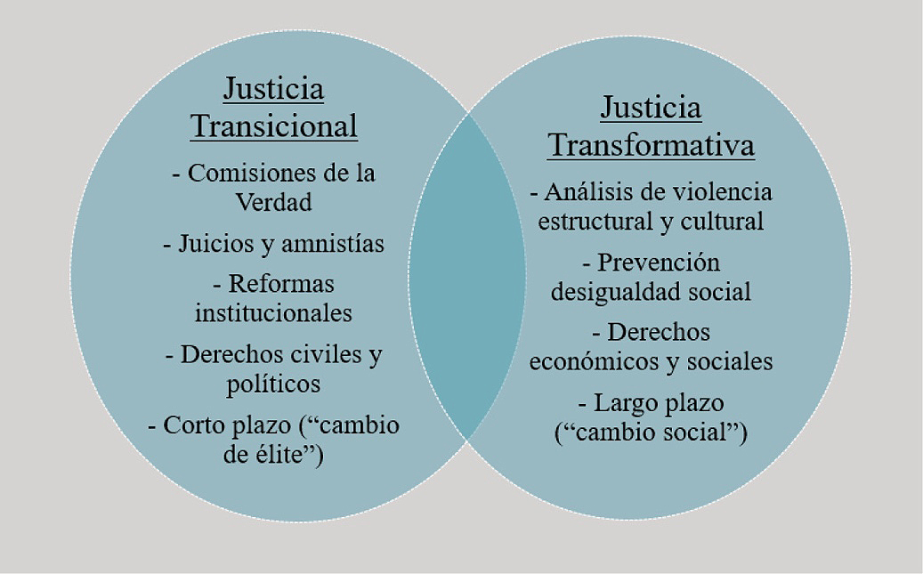 En conclusión, no se trata únicamente de restituir, sino también de transformar. Para ello, entendemos que es fundamental no olvidar, pero que además es necesario cambiar las condiciones para evitar realmente que se produzca una repetición. En este sentido, la figura 1 sintetiza los aspectos más destacables de cada uno de los conceptos de justicia tratados: la transicional y la transformativa. La zona común debería interpretarse como la existencia de «aspectos transformativos de la justicia transicional» (Evans, 2015: 9).