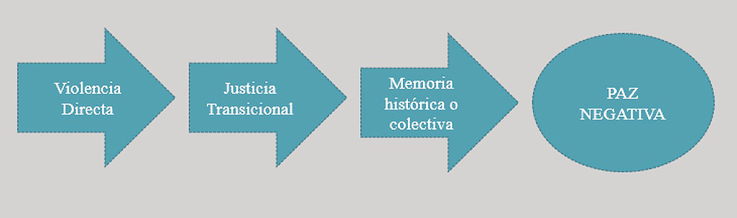 Antes de abordar el tránsito argumental al que hace referencia en la figura 4, resulta necesario plantear la relación conceptual que se ha detectado entre las distintas formas de violencia, paz, justicia y memoria. Así, tal y como muestra la figura 2, se ha observado, en primer lugar, cómo existe una vinculación conceptual entre violencia directa, paz negativa, justicia transicional y memoria histórica/colectiva, dado el significado y la dimensión de cada uno de estos conceptos. Es decir, entendemos que, si la paz negativa es la ausencia de violencia directa, los procesos de justicia transicional suponen, precisamente, la gestión de las consecuencias de conflictos en los que han tenido lugar actos de violencia directa. Finalmente, en este contexto, la memoria histórica o colectiva aspira a ser, cuanto menos, un elemento de construcción de paz negativa, como se puede observar en la siguiente figura.