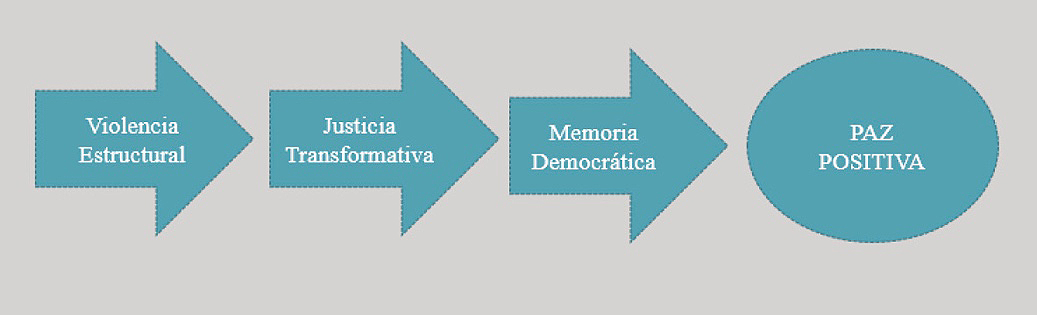 En conclusión, se propone tomar como marco teórico el concepto de paz positiva, por un lado, y el acervo resultante del ius post bellum, por el otro. Dos elementos que nos ayudarán a una mejor conceptualización de los debates y conceptos que se abordan a continuación. En primer lugar, la discusión en torno a la justicia transicional y la justicia transformativa. Y, en segundo lugar, la memoria (colectiva, histórica, democrática). Relaciones conceptuales que muestran la existencia de un vínculo argumental entre la violencia estructural, la violencia cultural, la paz positiva y las políticas públicas de memoria, en un contexto de gestión postconflicto (ius post bellum) (Peperkamp, 2017). Vinculación argumental que, a fortiori, asumimos como premisa para el presente artículo y que exploraremos a continuación.