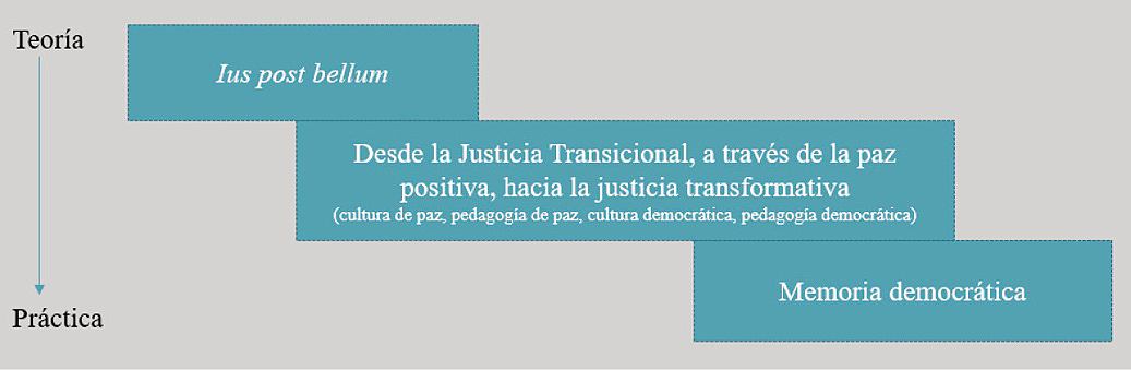 The academic reflection about peacebuilding and peacekeeping connects with theories such as the ius post bellum, which is a normative framework that connects with transitional justice and democratic memory. This paper proposes an encounter between these approaches. We analyze the extension of each concept, the points of intersection and differences. Finally, we move towards an incipient synthesis, as a contribution to the debate about the principles underlying the public policies of memory, peace, and human rights, in the context of implementation of the democratic memory law in Spain. For that purpose, this paper proposes to link three areas of study: the ius post bellum, the –transitional and transformative– justice and democratic memory. All this, in application perspective to manage the context of post-conflict situations and transition processes towards democratic systems after dictatorship scenarios, taking into account the Spanish case. In essence, the core of the article supports the utility of the ius post bellum theory –in a transformative and not merely restorative reading– for the normative foundation of public policies of democratic memory.
