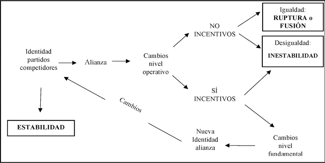 Además, teniendo en cuenta esta perspectiva, Barrio (2007: 48-49) elaboró un modelo de análisis sobre las dinámicas que se producen en la alianza y sobre cómo afectan a su mantenimiento (o ruptura) y su estabilidad (o inestabilidad) a partir de los factores que contemplan tanto Panebianco (polarización ideológica) como Duverger (tamaño o desigualdad organizativa). Un modelo en el que afirma que si los partidos competidores presentan un alto grado de igualdad, los conflictos identitarios internos son tan grandes que suelen terminar en ruptura o que, de no producirse, conllevará la fusión de los partidos y el nacimiento de una nueva identidad. Sin embargo, si los partidos competidores presentan diferencias de tamaño o un alto grado de desigualdad, la alianza podrá mantenerse, pero de manera inestable debido los conflictos internos generados por la alianza. Por consiguiente, argumenta que las alianzas entre partidos competidores sí pueden mantenerse si existe desigualdad entre sus miembros, aunque este será siempre un mantenimiento inestable[4].