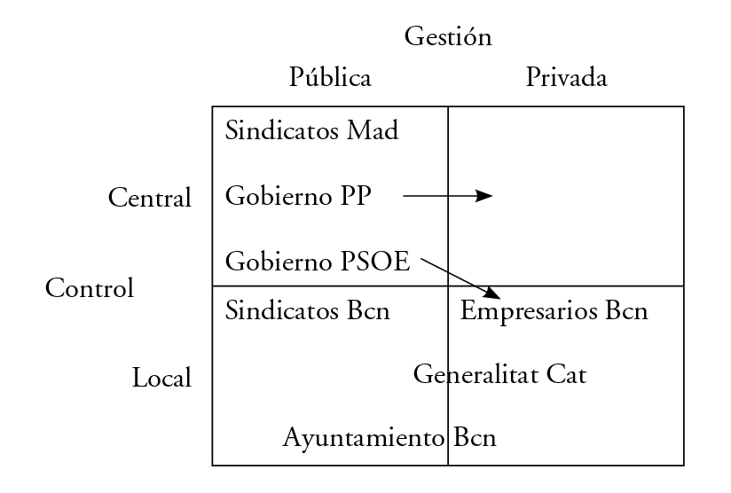 Los entrevistados coincidieron en afirmar que ni el Partido Socialista ni el Partido Popular habrían cambiado el modelo de gestión aeroportuaria si no se hubieran visto obligados por las extraordinarias circunstancias creadas por la crisis económica pero que las posiciones del gobierno con un partido y otro no eran exactamente coincidentes. Sí se produjo un cierto aprendizaje entre los miembros del gobierno del Partido Socialista que participaron en esta cuestión en la medida que sus preferencias cambiaron a favor de un modelo más liberalizado y abierto sobre la base de la autonomía de gestión de los aeropuertos de Madrid y Barcelona. Por el contrario, este aprendizaje no se daría en la misma medida en el caso del gobierno del Partido Popular. El gobierno socialista intentó salvaguardar los valores fundamentales de sus predecesores que fueron los creadores de AENA. Estos valores fundamentales se preservaban limitando la privatización a la externalización de una parte del negocio: «desde el aparcamiento hasta la puerta de embarque». Se excluían de la privatización los derechos de aterrizaje. Además el gobierno mantenía el control sobre las filiales que en cada aeropuerto serían las encargadas de controlar a las empresas que ganaran los concursos. El gobierno popular, en cambio, era más reacio a transferir competencias a cualquier otro nivel de gobierno por razones políticas. La ministra de Fomento ya declaró en enero de 2012 que «al gobierno no le gusta la idea de que los aeropuertos de Madrid y Barcelona compitan» ( El País , 24 de enero de 2012). Esta y otras declaraciones eran indicativas de que los cargos claves de su gobierno no estaban convencidos con la idea de romper AENA en favor de un sistema competitivo y descentralizado. El Gobierno popular acabó expresando su preferencia por mantener una AENA unificada con un elevado nivel de participación de capital privado. El gráfico 1 presenta esta leve modificación de las posiciones iniciales de los dos partidos en el gobierno.