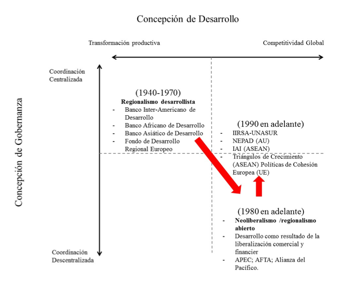 Sin embargo, ya a finales de los años noventa un número de iniciativas surgidas en el marco de proyectos regionales comenzó a desafiar, por una parte, la creencia en la automaticidad de los mercados y, por otra, la reducción de la cooperación para el desarrollo a fines exclusivamente humanitarios. Sin necesariamente ser un retorno al «regionalismo desarrollista» de las décadas de los años cincuenta y sesenta, estas iniciativas se pueden comprender como una gobernanza regional del desarrollo (Bruszt, L. y Palestini, S. (2016). Regional development governance. En T. Börzel y T. Risse. The Oxford handbook of comparative regionalism. Oxford: Oxford University Press.Bruszt y Palestini, 2016), orientada a articular y coordinar las políticas públicas y los recursos y capacidades existentes en contextos regionales concretos.