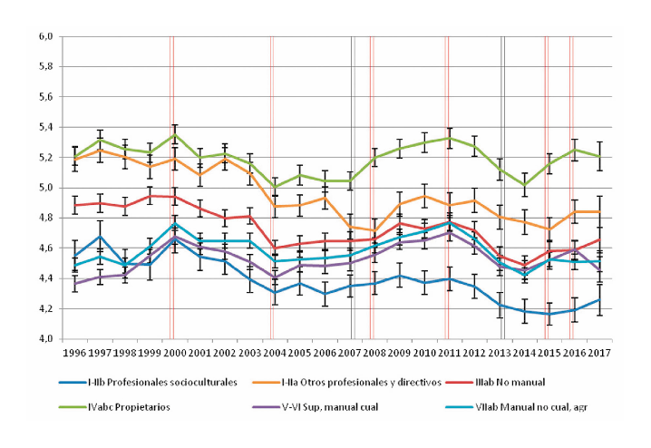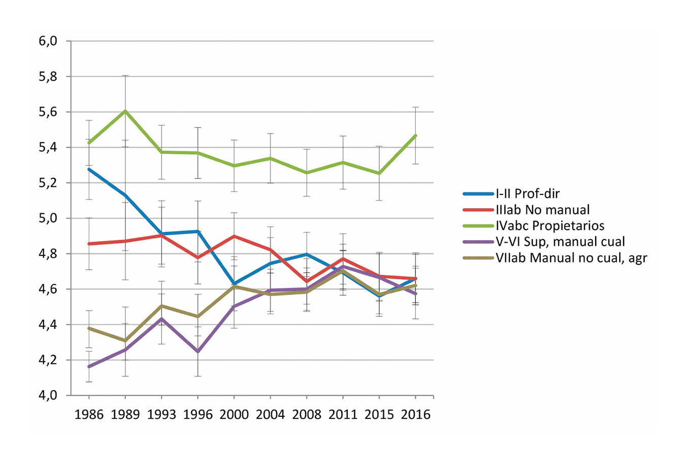 Una manera sencilla de hacer balance del alcance de los cambios registrados es calcular la desviación típica de las medias de las clases en cada punto temporal. Para las cinco clases, se observa entonces una disminución desde valores en torno a 0,5 en 1986 y 1989 a valores próximos a 0,25 entre 2008 y 2015, cuando la heterogeneidad de las clases alcanza su nivel mínimo, aunque al final de la serie se da un cambio en sentido contrario, con una desviación típica de 0,34. Pero lo más destacable es que si el cálculo se hace para cuatro clases, excluyendo a los propietarios, se pasa de desviaciones típicas de alrededor de 0,40 a finales de los ochenta una de 0,03 en 2016. Parece clara la existencia de un proceso de erosión de las diferencias hasta hacerlas despreciables (aunque alguien que adoptase una posición marxista clásica podría interpretarlo como un proceso de polarización entre capitalistas y trabajadores asalariados). |