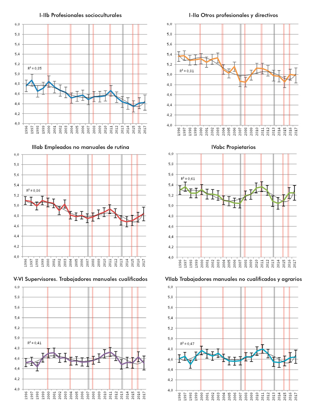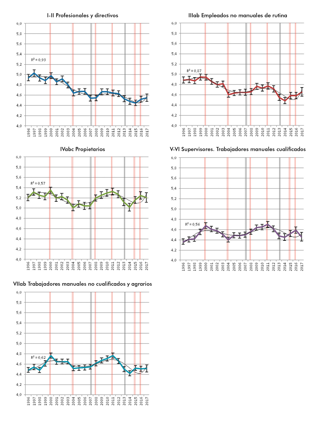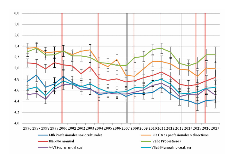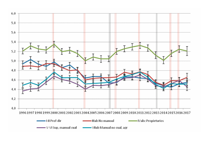 En los gráficos 2, 3, y 4, los paneles A y B contienen en realidad la misma información, en un caso (A) presentando conjuntamente todas las clases, para facilitar la comparación de sus posiciones, y en el otro (B), presentándolas por separado, a fin de que sea más fácil visualizar su trayectoria. Para este fin, en el panel B se incluyen líneas de tendencia correspondientes a la ecuación polinómica que, con carácter general, proporciona el mejor ajuste a los datos, que resultó ser de sexto orden. Por otra parte, es importante reparar en la escala de los gráficos: el eje vertical abarca solo dos puntos de la escala izquierda-derecha, es decir, un quinto de su recorrido. Esto permite captar mejor las diferencias entre clases y los cambios que han sufrido, pero puede inducir a percibirlos de modo magnificado. Téngase en cuenta que la mayor diferencia entre clases registrada en nuestros datos es de 1,35 puntos (la distancia que separaba a los propietarios y los obreros cualificados en 1989). |
