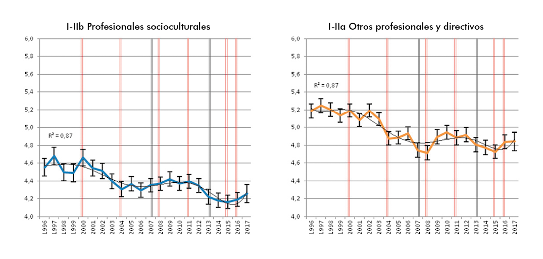 A pesar del interés del trabajo de Barone et al. y con independencia de las reservas que acabamos de expresar, creemos que nuestro estudio hace una valiosa aportación adicional. En primer lugar, porque cubre un período más amplio, incluyendo la etapa de la Gran Recesión y la poscrisis, lo cual permite comprobar si existen tendencias de cambio independientes del ciclo económico o si, por el contrario, ha habido tendencias de distinto signo en momentos de bonanza y de crisis. Además, los datos que manejamos son más ricos e informativos que los usados por Barone: por un lado, disponemos de barómetros mensuales que, agregados, garantizan estimaciones muy precisas a escala anual o incluso trimestral; por otro lado, la codificación detallada de la ocupación hace posible la aplicación de esquemas de clases desagregados, incluyendo una distinción entre distintos tipos de profesionales que nos parece crucial.