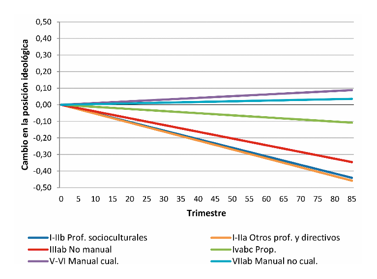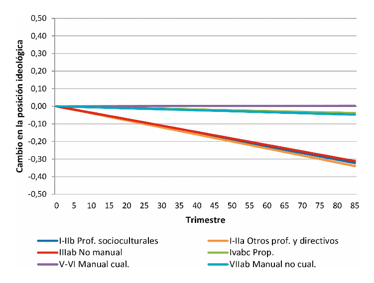 Como el de Barone y sus coautores, nuestro análisis tiene un importante componente descriptivo: su objetivo inicial es describir detalladamente la trayectoria seguida por la posición media de cada clase en el eje izquierda-derecha. Sin embargo, una vez identificadas las modificaciones sufridas por la relación entre clase e ideología, que, como veremos, tienen como protagonistas principales a la clase profesional-directiva y a los empleados no manuales, haremos frente a la necesidad de explicarlas, tratando de determinar si es posible darles a los cambios registrados una explicación social, ya sea apelando a la existencia de efectos de composición o a procesos de reemplazo generacional. Como veremos, ninguna de estas dos vías de explicación permite dar cuenta plenamente de los cambios observables. Avanzaremos, por ello, posibles explicaciones alternativas, que dejaremos pendientes de contrastación.