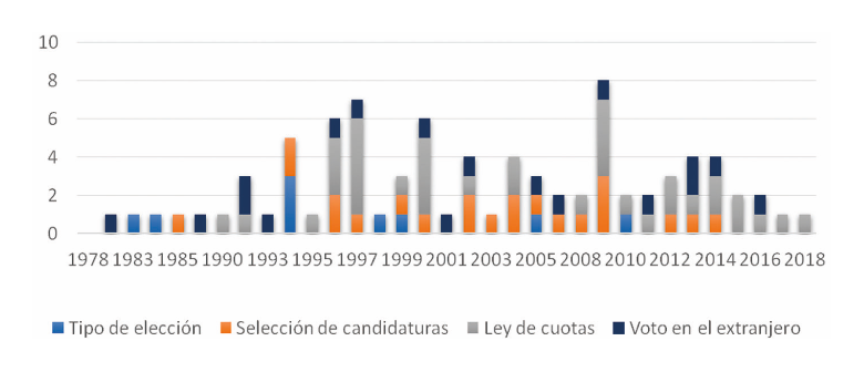 Este trabajo busca contribuir a la investigación comparada realizada sobre las reformas electorales en dieciocho países latinoamericanos ( Zovatto, D. (2018). Reforma político-electoral e innovación institucional en América Latina (1978-2016). Ciudad de México: Tirant lo Blanch.Zovatto, 2018; Freidenberg, F. y Došek, T. (2016a). Las reformas electorales en América Latina: hacia una conceptualización más amplia. En F. Tuesta Soldevilla (ed.). Representación política en América Latina. Lima: Jurado Nacional de Elecciones.Freidenberg y Došek, 2016a; Scherlis, G. (2015). La política de la reforma electoral en América Latina: entre la apertura y el cierre de los sistemas políticos a través de la regulación electoral y de partidos. Desarrollo Económico, 55 (215), 83-104.Scherlis, 2015; Molenaar, F. (2012). Latin American regulation of political parties: continuing trends and breaks with the past. Working Paper Series on the Legal Regulation of Political Parties, 17.Molenaar, 2012; Negretto, G. (2010). La reforma política en América Latina. Reglas electorales y distribución de poder entre Presidente y Congreso. Desarrollo Económico, 50 (198), 197-221.Negretto, 2010) con la intención de establecer si en el período 2015-2018 se mantuvieron las agendas reformistas (y el mismo sentido de las reformas) del período previo (1978-2015) o si, por el contrario, se está ante nuevos temas, ritmos y orientación del cambio normativo. La principal conclusión de aquellas investigaciones fue que las reformas generaban incentivos contradictorios para los actores —élites y ciudadanía— entre la concentración del poder y la mayor inclusión y representatividad de los actores políticos ( Freidenberg, F. y Došek, T. (2016a). Las reformas electorales en América Latina: hacia una conceptualización más amplia. En F. Tuesta Soldevilla (ed.). Representación política en América Latina. Lima: Jurado Nacional de Elecciones.Freidenberg y Došek, 2016a), así como también por la división entre países hiperactivos, moderados y pasivos según el ritmo y la intensidad de esos cambios institucionales.