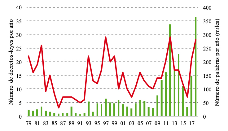 This paper applies statistical analysis techniques on the 574 royal decree laws approved in Spain between 1979 and 2018. It studies the frequency of their use, their extension, complexity and impact on the legal system, as well as the subsequent parliamentary procedure and the level of litigiousness before the Constitutional Court. Correlations are sought between these elements and the economic and political-institutional context in which decree laws are issued. The results clearly show an impact of the financial crisis in the approval of decree-laws in given matters, in their length and in their impact on the legal system. It is also observed that a greater parliamentary fragmentation moderately favours decrees law to be introduced as bills and, on the contrary, decree laws approved by governments with absolute majority are more frequently challenged in court. The results of the analysis are the basis for raising critical concerns and proposals for improvement.