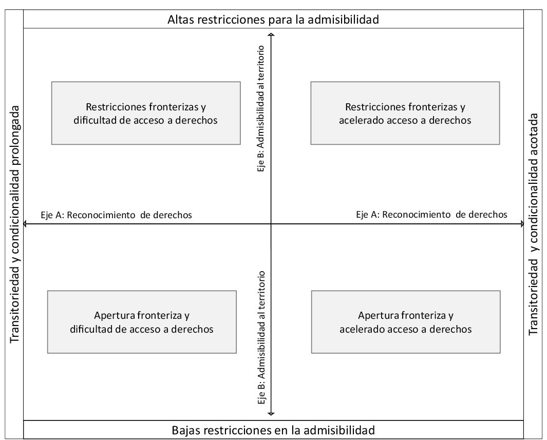 En cuanto a las condiciones para el reconocimiento de derechos, los discursos se ordenan en torno a visiones diferenciadas sobre la capacidad del Estado para determinar las trayectorias de asentamiento de los extranjeros y en relación con el sentido que deben tener esas trayectorias. Sobre ese eje se articulan cuatro modelos categoriales sintetizados en el cuadro 2: el modelo de asentamiento planificado, el de asentamiento excluyente, el que asume una condicionalidad por defecto, y el modelo garantista de condicionalidad limitada.