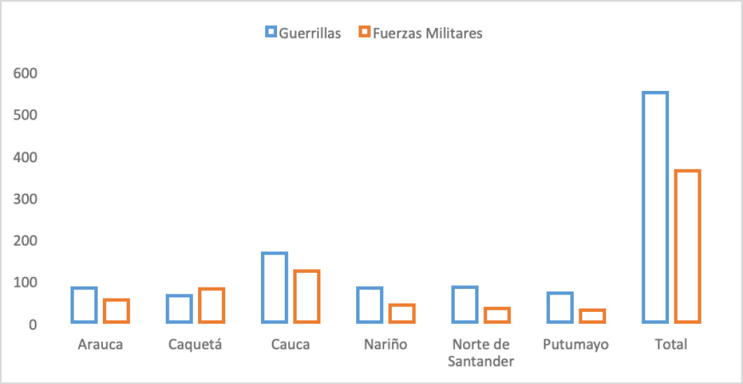 Fuente: elaboración propia con base en el ODHDIH (Observatorio de Derechos Humanos y Derecho Internacional Humanitario (ODHDIH). (s. f.) Síntesis de la violencia y la confrontación armada en Colombia, 1998-2012 y 2015. Bogotá.s. f.).