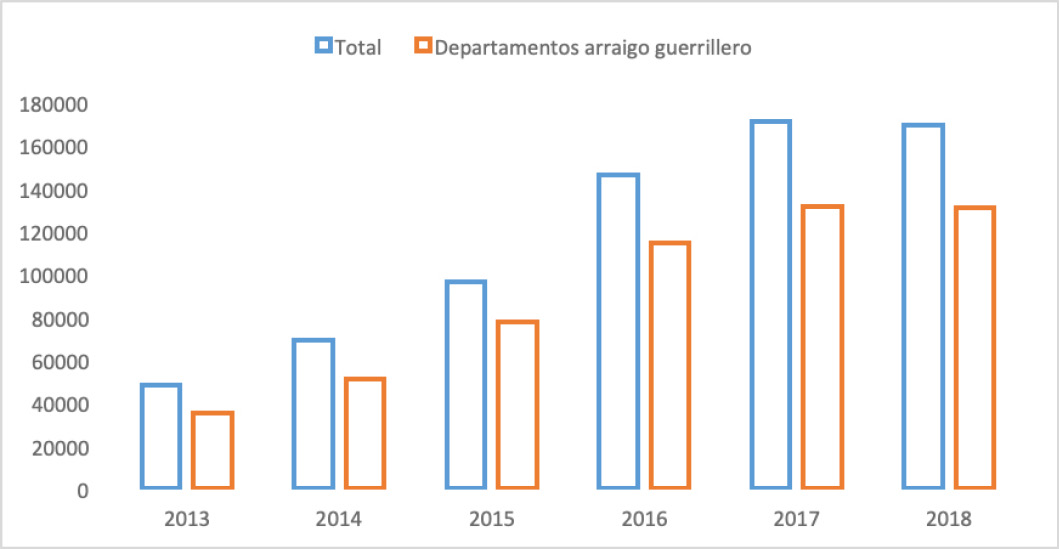 Superficie cocalera con respecto a los departamentos de arraigo guerrillero (2013-2018)