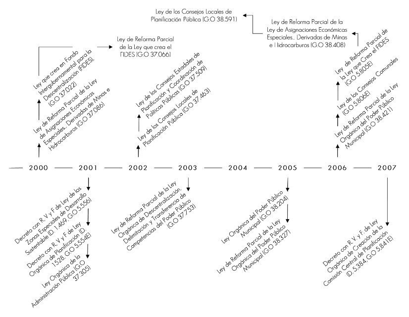 Consultar al respecto a Rachadell (Rachadell, M. (2006). La descentralización del poder en Venezuela. Provincia, 16, 199-282.2006) y Olivares et al. (Olivares, J., D’Elia, Y. y Cabezas, F. (2010). En defensa de la descentralización. Caracas: Instituto Latinoamericano de Investigaciones Sociales; CONVITE, A.C.2010). |