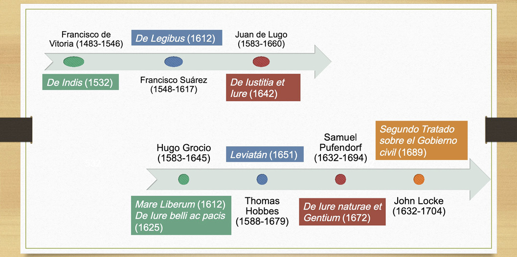 Comparemos ahora la obra de Juan de Lugo con la tradición escolástica. En la figura 1 representamos la posición que ocupa Juan de Lugo en la tradición iusnaturalista cristiana y lo contrastamos con los principales hitos y autores del iusnaturalismo racionalista. Para realizar una mejor comparación agregamos la fecha de la primera publicación de sus principales obras. Como podemos ver, Lugo nació cien años después que el fundador de la escuela de Salamanca, Francisco de Vitoria. Además, comenzó a escribir en su etapa de madurez: su principal obra, De iustitia et iure, se publicó en 1642, cuando Lugo tenía cincuenta y nueve años. Si lo comparamos con De indis, de Vitoria, la distancia que los separa es de ciento diez años; una distancia mucho mayor que los diecisiete años que existe entre la publicación de De iure belli ac pacis en 1625 de Hugo Grocio y apenas nueve años antes de que Hobbes publicara su Leviatán, en 1651. Por consiguiente, Lugo probablemente conocía la obra de Grocio y su interpretación laica del iusnaturalismo cristiano. Escribió en unos momentos en donde los filósofos del derecho natural se estaban desprendiendo de la impronta cristiana para que en poco menos de una década esta tradición se adaptara por completo a la filosofía política de la mano de Hobbes. Por tanto, no es sorprendente que la interpretación que da Lugo de la doctrina de la propiedad en poco difiera de la de los grandes maestros del siglo xvii como Pufendorf y Locke. Los tres bebieron de las mismas fuentes escolásticas y los tres las amoldaron a una realidad diferente que requería de grandes dosis de secularización en sus planteamientos.