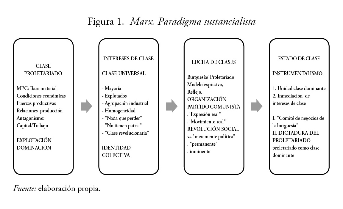 El paradigma de la producción postula una lógica de la explicación de la realidad social sustancialista y lineal (cfr. figura 1) que parte de la preconstitución del proletariado como clase en el nivel de las relaciones de producción dominantes en el modo de producción capitalista (I); lo cual genera un antagonismo estructural entre la burguesía y la clase trabajadora sobre la base de la relación material capital/trabajo asalariado, causa de relaciones específicas de explotación y dominación. Los intereses compartidos, homogéneos, de lo que va a constituir la mayoría de la población convertirán al proletariado en una clase unida, progresivamente organizada, movilizada e inevitablemente revolucionaria, alumbrando una identidad de clase que se impone sobre cualquier otra eventual identidad colectiva: nacional, religiosa etc. (II); esta clase obrera, preconstituída como clase desde las relaciones de producción y consciente de sus intereses como clase para sí, entra en conflicto antagónico con la burguesía y el mundo capitalista, expresándose como lucha política diferenciada que alienta una revolución no meramente política sino social (III); finalmente, el triunfo de la revolución se traducirá, siempre según este marco teórico, en la elevación del proletariado a clase dominante, la toma del aparato de Estado y su puesta a disposición de los intereses de las clases trabajadoras y consiguientes transformaciones revolucionarias, la abolición del modo de producción capitalista (dictadura del proletariado) (IV).