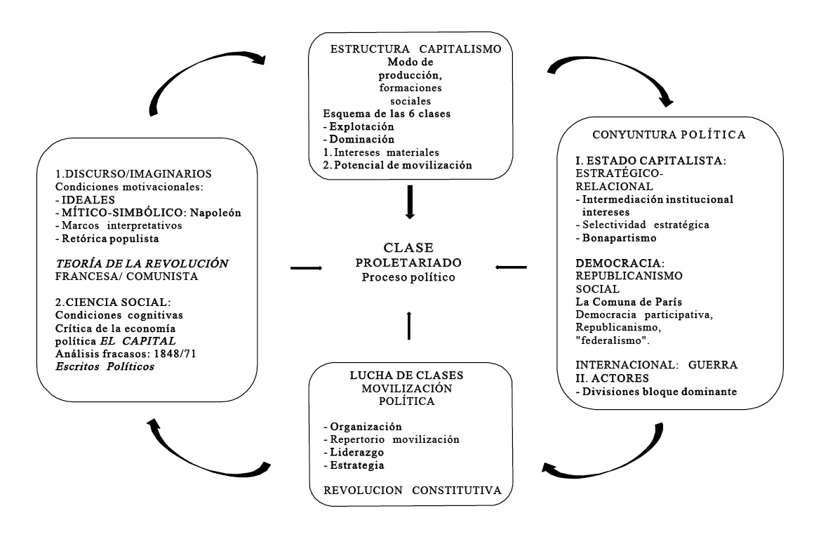 Se presenta, así, un concepto de clase, en estado práctico, nunca teorizado del todo, que no se reduce a la inmediatez de la posición ocupada en las relaciones de producción, sino que se construye (y deconstruye) históricamente mediante un proceso multicausal en la esfera da política: de representación, creación de identidad, cultura, tradición histórica, complexo mítico-simbólico específico, etc. Las clases, para el Marx de los escritos políticos, proceden, de modo mediato, de una eventual matriz de intereses compartidos y el potencial de movilización que nace de aquella, pero que tiene que ser actualizado políticamente. Ese tránsito dista mucho de constituir una mera exteriorización o expresión, un mero traslado de la estructura a la identidad colectiva y de la identidad a la acción. Los intereses e identidades resultan no solo son rearticulados en demandas específicas, sino modulados y transformados en el seno de una estructura de oportunidad política más o menos favorable, mediante mecanismos performativos de organización, liderazgo y movilización, así como de un discurso que unifique, enmarque y dote de sentido a los rasgos de esa identidad de clase. Esta última, además, se desarrolla siempre en competencia con otras posibles identificaciones (nación, religión, etc.) (cfr. figura 2).