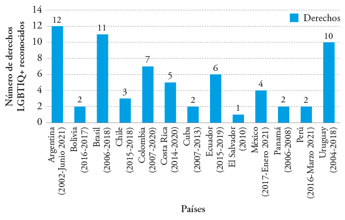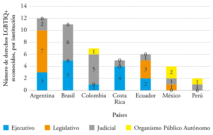 Los países que han reconocido derechos a las personas de las diversidades sexuales y de género a través del mecanismo de las cortes supremas y tribunales han sido siete: Argentina, Brasil, Colombia, Costa Rica, Ecuador, México y Perú. Hasta del día de hoy, la situación del reconocimiento de derechos en estos países es la siguiente: Argentina ha reconocido doce derechos a favor de las personas LGBT a nivel nacional y, entre estos, dos han sido a través de la Corte; Brasil tiene once derechos de los cuales seis fueron también vía Corte Suprema; Colombia lleva siete derechos reconocidos y cinco se consiguieron en esa misma instancia; Costa Rica ha acumulado cinco derechos y uno ha sido por sentencia de la Corte Suprema de Justicia; Ecuador cuenta con seis derechos y uno de ellos se logró por el mecanismo de la Corte; de los cuatro derechos nacionales LGBT que tiene México uno fue por fallo de la Suprema Corte de Justicia; y, finalmente, de los dos derechos que tiene Perú uno fue producto de un fallo del Tribunal Constitucional.