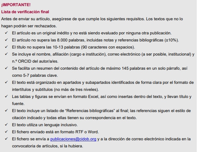 El equipo editorial se reserva el derecho de modificar el formato de acrónimos, siglas, referencias bibliográficas, notas, cargos oficiales, etc., en aras de la coherencia global que requiere una publicación periódica y conforme al Libro de Estilo de CIDOB.