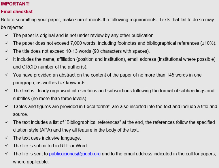 Enviar el texto por e-mail en formato Word o RTF a publicaciones@cidob.org.