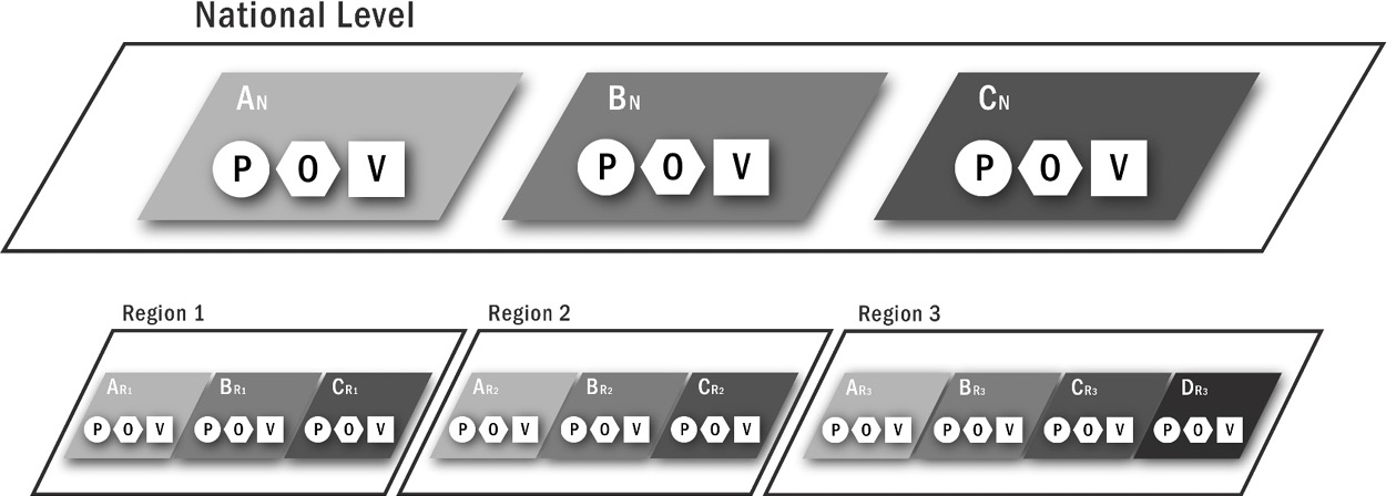 Figure 1 depicts an example of government formation negotiations in multi-level, multi-parliament perspective. There are three parties involved in negotiations at the national level (AN, BN, CN), each of which must make choices about party goals: policy (P), office (O) and votes (V). There are also three regions with corresponding regional party branches of the national parties (AR, BR, CR). In Region 3, the figure also depicts a regional party (DR3) which only presents candidates in regional elections. While such regional parties were not relevant in the regions we examine ahead, they are in many of Spain’s regions and in other multilevel states.