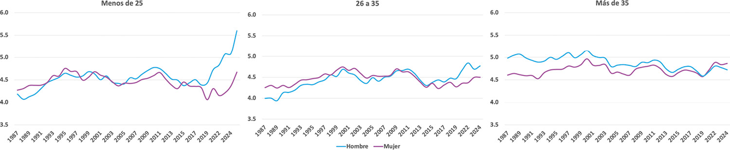 Diferencia de la media ideológica entre hombres y mujeres menores de 25 años en España (1987-2024)