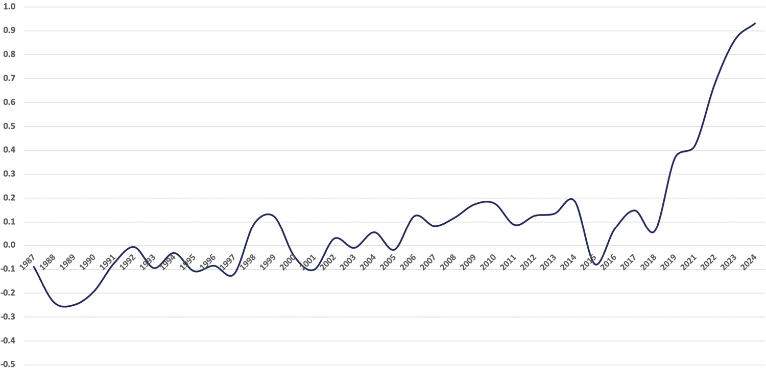 Para visualizar de manera más clara este cambio de tendencia, en el Gráfico 2 se muestra la brecha en la autoubicación ideológica entre hombres y mujeres, centrándonos en los menores de 25 años a lo largo de las últimas cuatro décadas. Los valores negativos reflejan una mayor propensión de las mujeres a ubicarse en la derecha en comparación con los hombres, mientras que los valores positivos indican una mayor tendencia de las mujeres a ubicarse en posiciones más izquierdistas. En el gráfico se observa la manera en que la brecha de género, que previamente a los años 90 venía situando a las mujeres ligeramente más a la derecha que los hombres, y que en décadas anteriores a los 80 también constataba un mayor apoyo de las mujeres a los elementos ideológicos conservadores (Pintor, 1981), ha experimentado un cambio significativo hacia la nueva brecha de género desde 2018. Es a partir de este año cuando dicha brecha comenzó a ampliarse de forma notable, con las mujeres jóvenes posicionándose casi un punto más a la izquierda que los hombres de su misma edad en el año 2024. Aunque es pronto para llegar a conclusiones definitivas, esta inversión en la tendencia tradicional de autoubicación ideológica por género podría estar apuntando a un cambio profundo en el panorama político y en las percepciones ideológicas de la población en España, lo que hace necesario un estudio en profundidad de su evolución y de sus posibles causas.